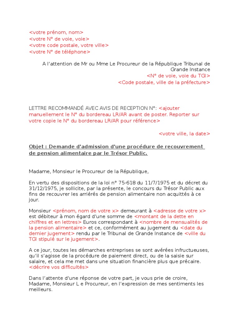 Demande de recouvrement d'une pension alimentaire par le Trésor Public